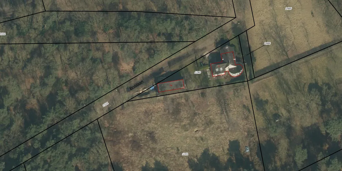 Boslaan 2-a is gelegen op kadastraal perceel GMT00B1240. Deze kadastrale aanduiding is uniek en wordt gebruikt door het Kadaster om eigendomsrechten en andere zakelijke rechten vast te leggen. Het perceel maakt onderdeel uit van de kadastrale gemeente Gemert.