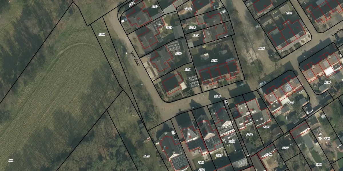 Het perceel waarop Varelaar 23 staat heeft een oppervlakte van 423 m². Dit is een groot perceel. De perceeloppervlakte wordt geregistreerd door het Kadaster. Gedetailleerde informatie over de maten van dit perceel kunt u vinden in het rapport Kadastrale kaart met maatvoering van Varelaar 23.