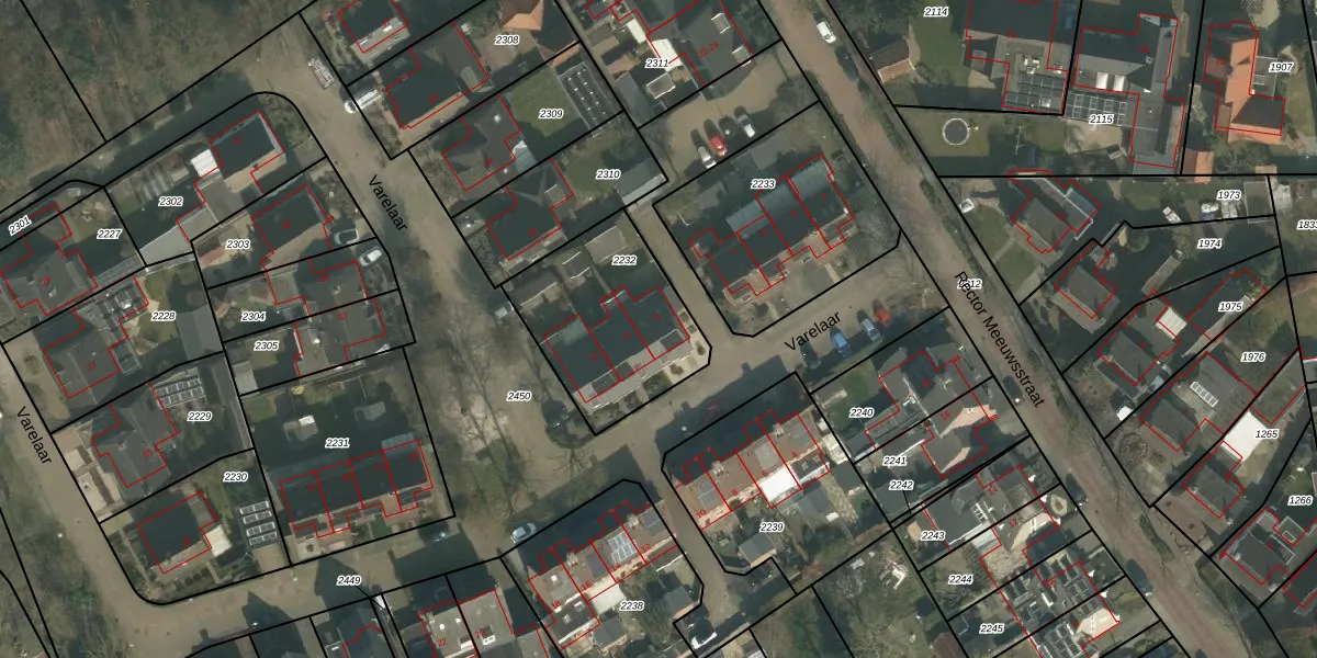 Het perceel waarop Varelaar 9 staat heeft een oppervlakte van 594 m². Dit is een groot perceel. De perceeloppervlakte wordt geregistreerd door het Kadaster. Gedetailleerde informatie over de maten van dit perceel kunt u vinden in het rapport Kadastrale kaart met maatvoering van Varelaar 9.