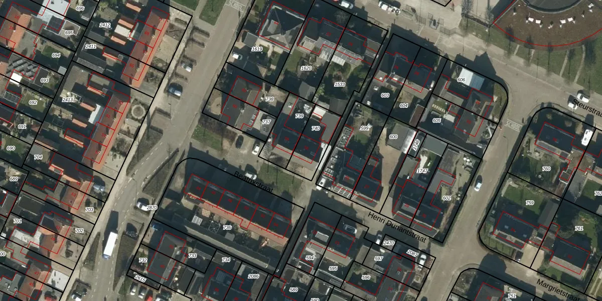 Gebruik de zoekbalk of klik op een perceel voor informatie over de adressen binnen dit perceel.