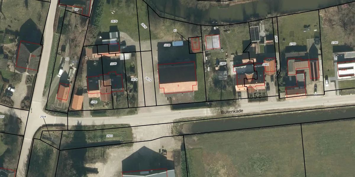 Buitenkade 5 is gelegen op kadastraal perceel DSN03R1038. Deze kadastrale aanduiding is uniek en wordt gebruikt door het Kadaster om eigendomsrechten en andere zakelijke rechten vast te leggen. Het perceel maakt onderdeel uit van de kadastrale gemeente Dussen.