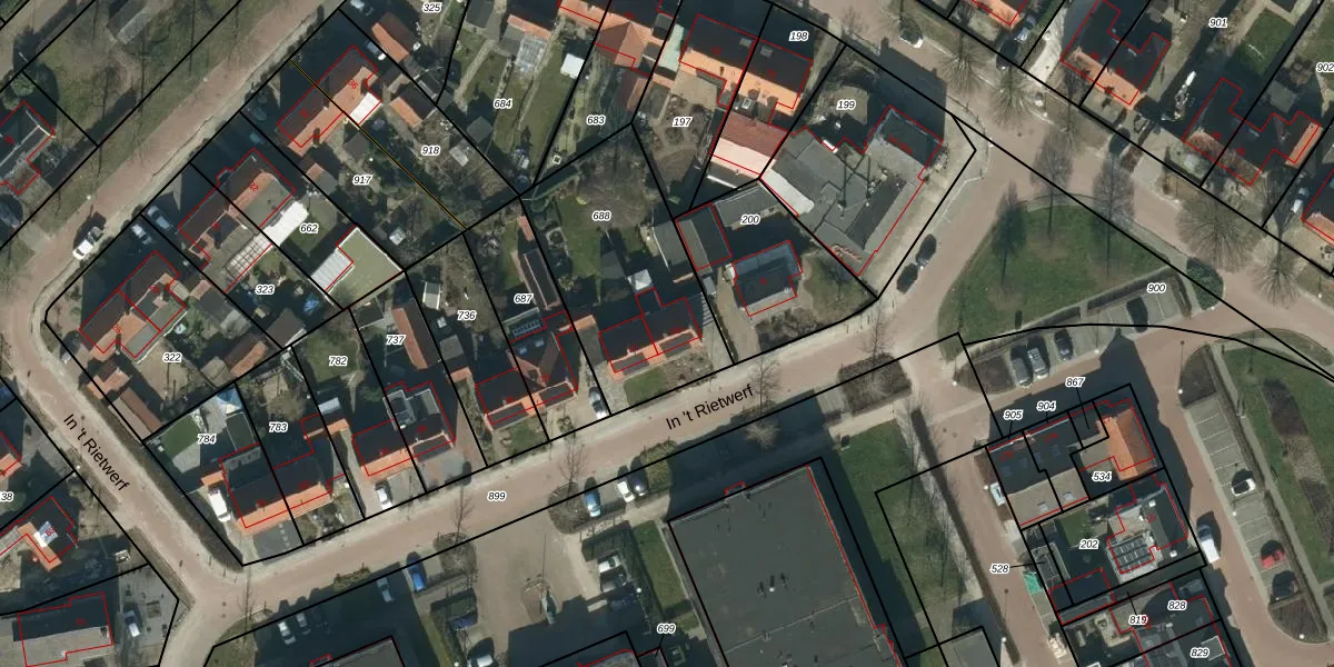 Het perceel waarop In 't Rietwerf 10 staat heeft een oppervlakte van 747 m². Dit is een groot perceel. De perceeloppervlakte wordt geregistreerd door het Kadaster. Gedetailleerde informatie over de maten van dit perceel kunt u vinden in het rapport Kadastrale kaart met maatvoering van In 't Rietwerf 10.