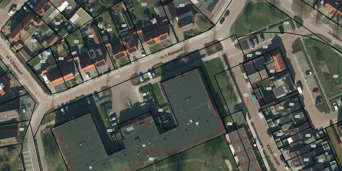 Het perceel waarop In 't Rietwerf 13 staat heeft een oppervlakte van 3100 m². Dit is een zeer groot perceel. De perceeloppervlakte wordt geregistreerd door het Kadaster. Gedetailleerde informatie over de maten van dit perceel kunt u vinden in het rapport Kadastrale kaart met maatvoering van In 't Rietwerf 13.