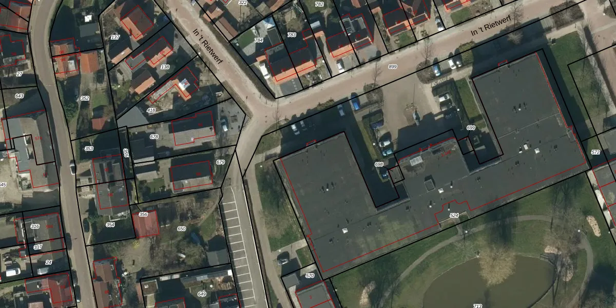Het perceel waarop In 't Rietwerf 47 staat heeft een oppervlakte van 3100 m². Dit is een zeer groot perceel. De perceeloppervlakte wordt geregistreerd door het Kadaster. Gedetailleerde informatie over de maten van dit perceel kunt u vinden in het rapport Kadastrale kaart met maatvoering van In 't Rietwerf 47.