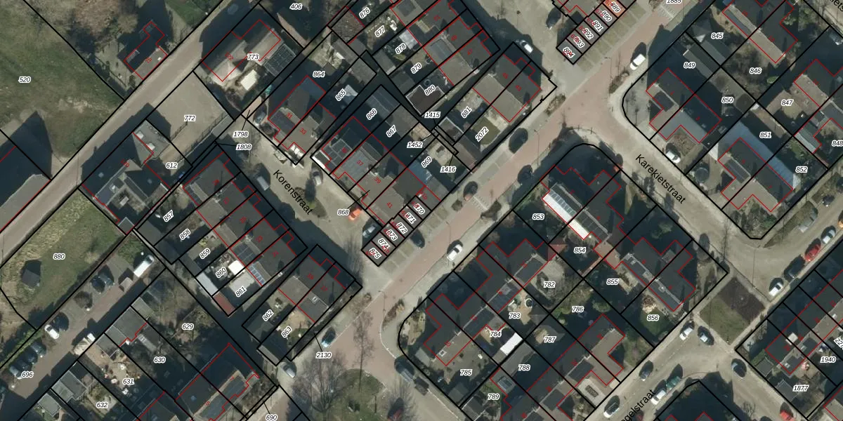 Het perceel waarop Korenstraat 41-f staat heeft een oppervlakte van 16 m². Dit is een klein perceel. De perceeloppervlakte wordt geregistreerd door het Kadaster. Gedetailleerde informatie over de maten van dit perceel kunt u vinden in het rapport Kadastrale kaart met maatvoering van Korenstraat 41-f.