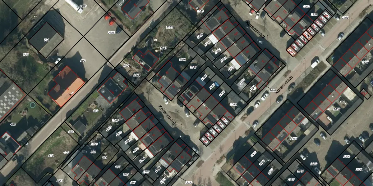 Korenstraat 87 is gelegen op kadastraal perceel DSN03R1048. Deze kadastrale aanduiding is uniek en wordt gebruikt door het Kadaster om eigendomsrechten en andere zakelijke rechten vast te leggen. Het perceel maakt onderdeel uit van de kadastrale gemeente Dussen.