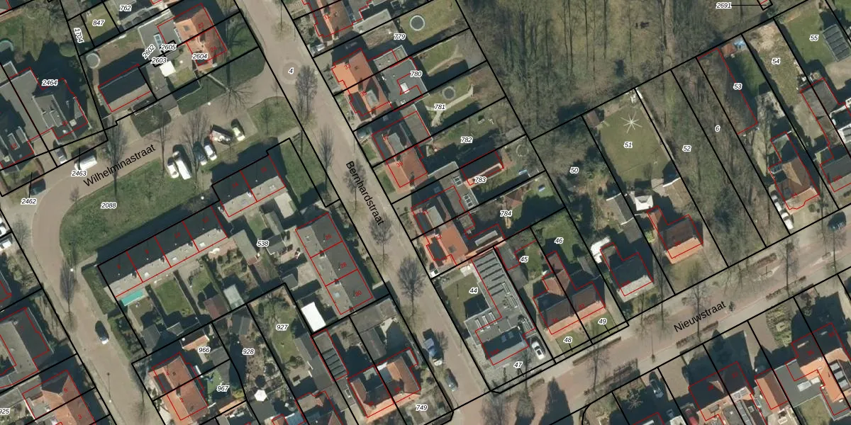 Het perceel waarop Bernhardstraat 41 staat heeft een oppervlakte van 355 m². Dit is een groot perceel. De perceeloppervlakte wordt geregistreerd door het Kadaster. Gedetailleerde informatie over de maten van dit perceel kunt u vinden in het rapport Kadastrale kaart met maatvoering van Bernhardstraat 41.
