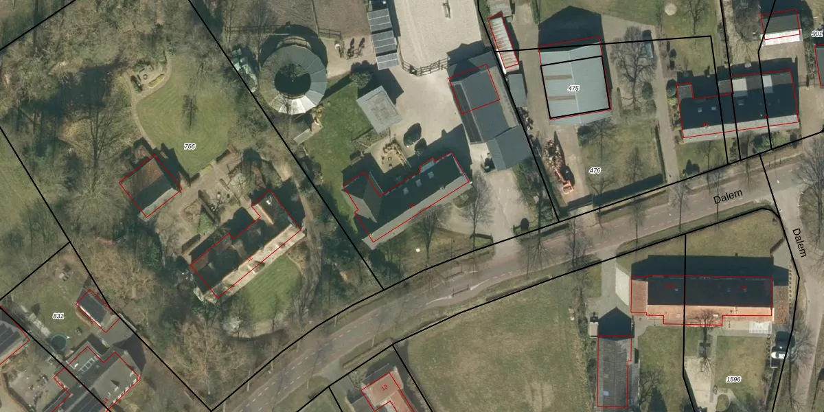 Het perceel waarop Dalem 10 staat heeft een oppervlakte van 7950 m². Dit is een zeer groot perceel. De perceeloppervlakte wordt geregistreerd door het Kadaster. Gedetailleerde informatie over de maten van dit perceel kunt u vinden in het rapport Kadastrale kaart met maatvoering van Dalem 10.