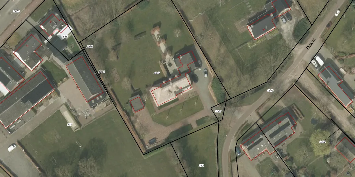 Het perceel waarop Dalem 23 staat heeft een oppervlakte van 4375 m². Dit is een zeer groot perceel. De perceeloppervlakte wordt geregistreerd door het Kadaster. Gedetailleerde informatie over de maten van dit perceel kunt u vinden in het rapport Kadastrale kaart met maatvoering van Dalem 23.