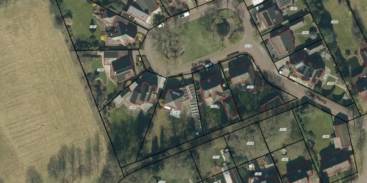 Het perceel waarop De Ploeg 12 staat heeft een oppervlakte van 970 m². Dit is een groot perceel. De perceeloppervlakte wordt geregistreerd door het Kadaster. Gedetailleerde informatie over de maten van dit perceel kunt u vinden in het rapport Kadastrale kaart met maatvoering van De Ploeg 12.