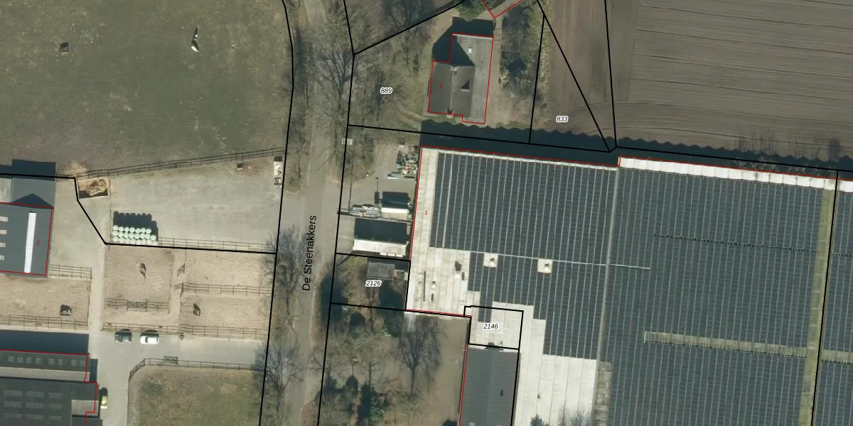 Het perceel waarop De Steenakkers 1 staat heeft een oppervlakte van 9320 m². Dit is een zeer groot perceel. De perceeloppervlakte wordt geregistreerd door het Kadaster. Gedetailleerde informatie over de maten van dit perceel kunt u vinden in het rapport Kadastrale kaart met maatvoering van De Steenakkers 1.