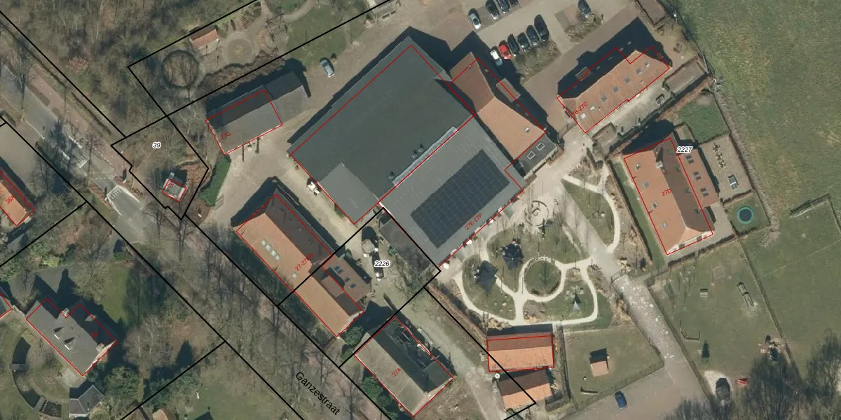Het perceel waarop Ganzestraat 27-E staat heeft een oppervlakte van 2,4 ha. Dit is een zeer groot perceel. De perceeloppervlakte wordt geregistreerd door het Kadaster. Gedetailleerde informatie over de maten van dit perceel kunt u vinden in het rapport Kadastrale kaart met maatvoering van Ganzestraat 27-E.