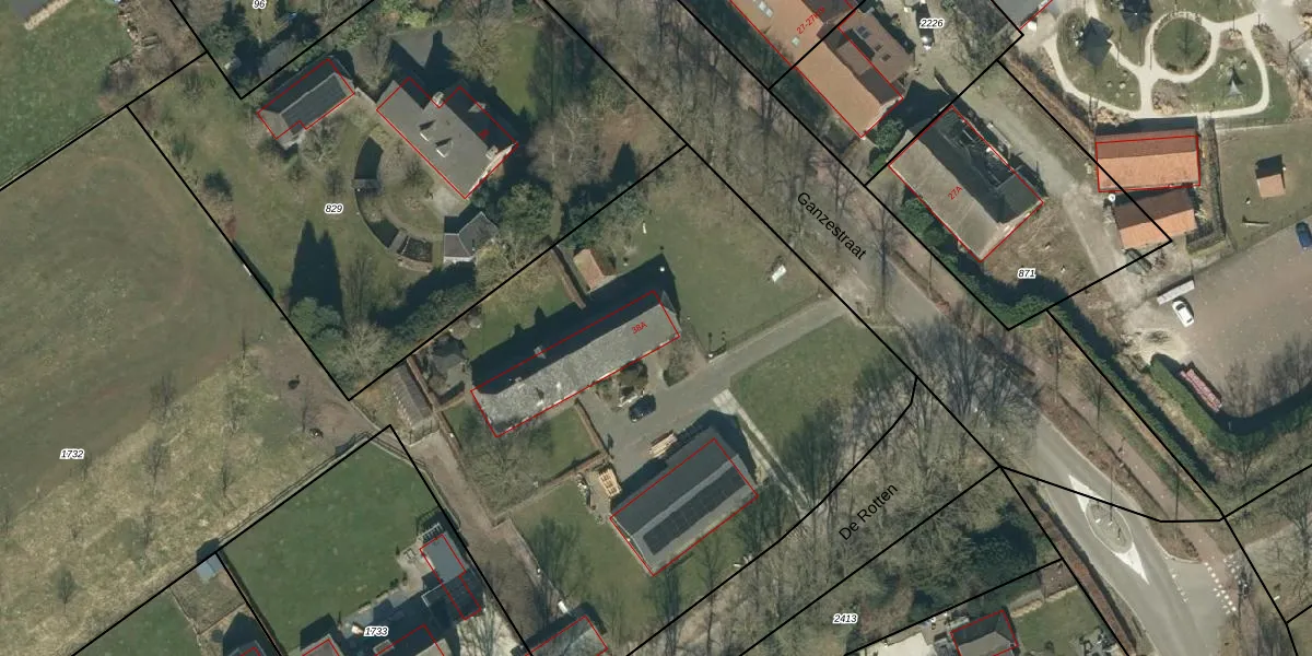 Het perceel waarop Ganzestraat 38-A staat heeft een oppervlakte van 1,9 ha. Dit is een zeer groot perceel. De perceeloppervlakte wordt geregistreerd door het Kadaster. Gedetailleerde informatie over de maten van dit perceel kunt u vinden in het rapport Kadastrale kaart met maatvoering van Ganzestraat 38-A.