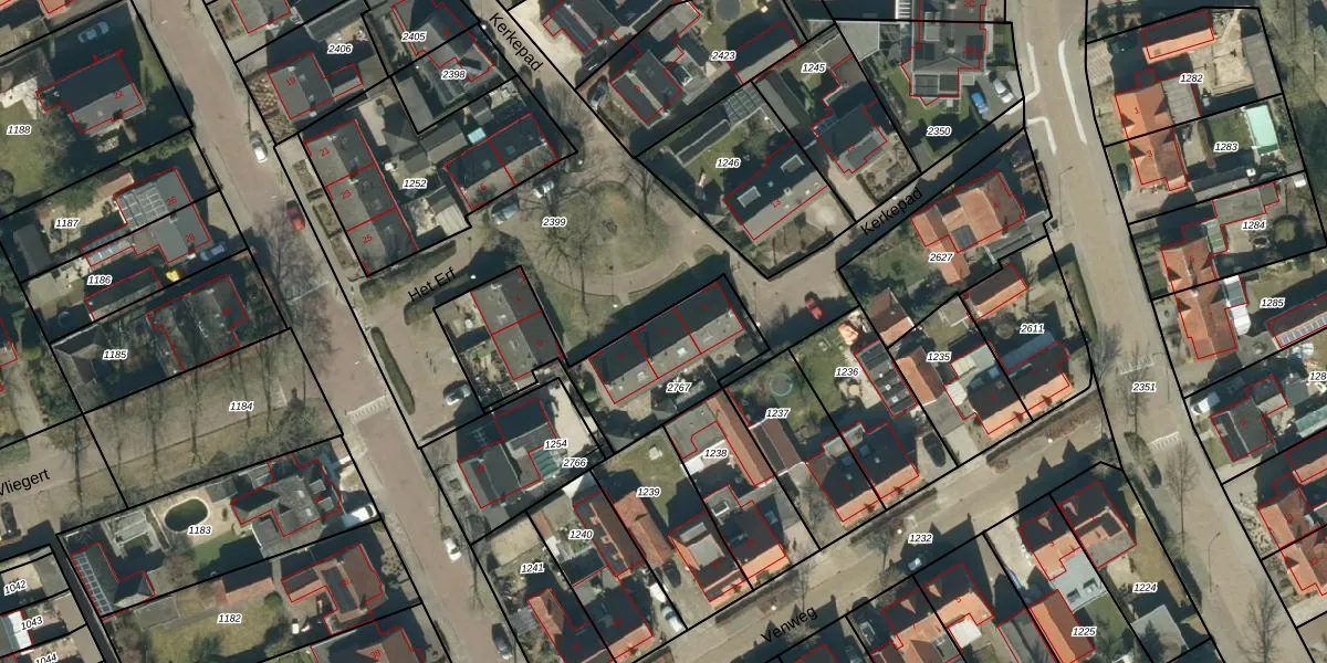 Het perceel waarop Het Erf 2 staat heeft een oppervlakte van 639 m². Dit is een groot perceel. De perceeloppervlakte wordt geregistreerd door het Kadaster. Gedetailleerde informatie over de maten van dit perceel kunt u vinden in het rapport Kadastrale kaart met maatvoering van Het Erf 2.