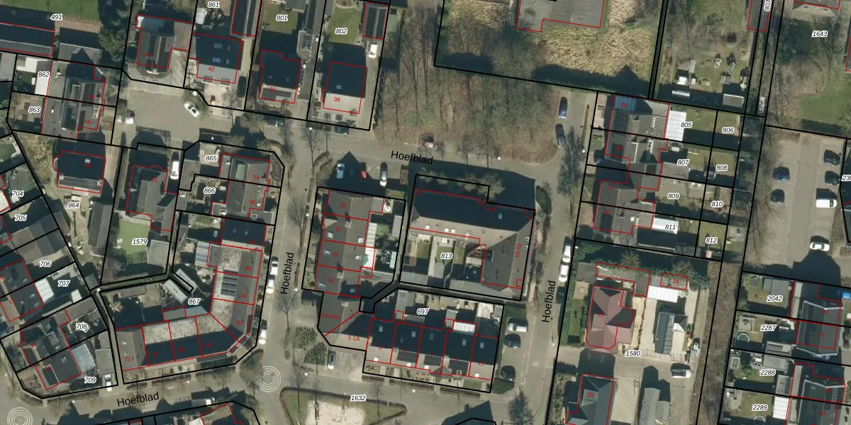 Het perceel waarop Hoefblad 23 staat heeft een oppervlakte van 692 m². Dit is een groot perceel. De perceeloppervlakte wordt geregistreerd door het Kadaster. Gedetailleerde informatie over de maten van dit perceel kunt u vinden in het rapport Kadastrale kaart met maatvoering van Hoefblad 23.