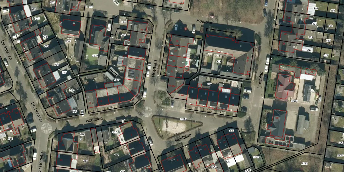 Het perceel waarop Hoefblad 33 staat heeft een oppervlakte van 1249 m². Dit is een zeer groot perceel. De perceeloppervlakte wordt geregistreerd door het Kadaster. Gedetailleerde informatie over de maten van dit perceel kunt u vinden in het rapport Kadastrale kaart met maatvoering van Hoefblad 33.