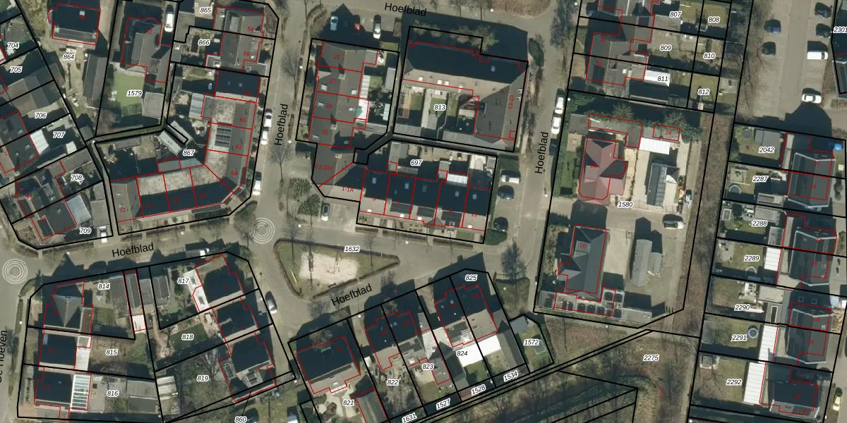 Het perceel waarop Hoefblad 7 staat heeft een oppervlakte van 1249 m². Dit is een zeer groot perceel. De perceeloppervlakte wordt geregistreerd door het Kadaster. Gedetailleerde informatie over de maten van dit perceel kunt u vinden in het rapport Kadastrale kaart met maatvoering van Hoefblad 7.