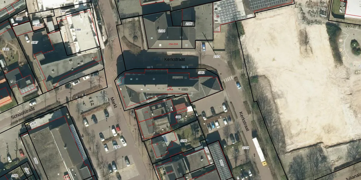 Het perceel waarop Kerkstraat 44 staat heeft een oppervlakte van 969 m². Dit is een groot perceel. De perceeloppervlakte wordt geregistreerd door het Kadaster. Gedetailleerde informatie over de maten van dit perceel kunt u vinden in het rapport Kadastrale kaart met maatvoering van Kerkstraat 44.