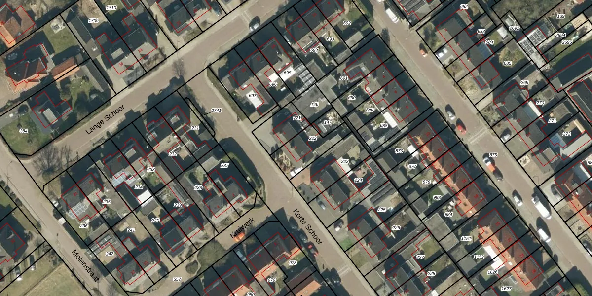 Het perceel waarop Korte Schoor 3 staat heeft een oppervlakte van 219 m². Dit is een middelgroot perceel. De perceeloppervlakte wordt geregistreerd door het Kadaster. Gedetailleerde informatie over de maten van dit perceel kunt u vinden in het rapport Kadastrale kaart met maatvoering van Korte Schoor 3.