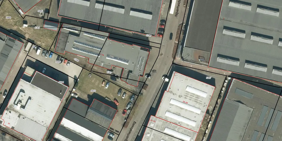 Het perceel waarop Nijverheidsweg 7 staat heeft een oppervlakte van 1015 m². Dit is een zeer groot perceel. De perceeloppervlakte wordt geregistreerd door het Kadaster. Gedetailleerde informatie over de maten van dit perceel kunt u vinden in het rapport Kadastrale kaart met maatvoering van Nijverheidsweg 7.