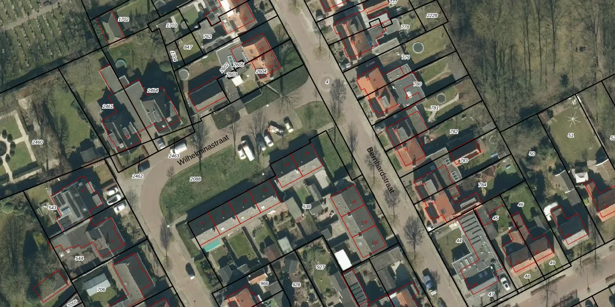 Het perceel waarop Wilhelminastraat 16 staat heeft een oppervlakte van 1735 m². Dit is een zeer groot perceel. De perceeloppervlakte wordt geregistreerd door het Kadaster. Gedetailleerde informatie over de maten van dit perceel kunt u vinden in het rapport Kadastrale kaart met maatvoering van Wilhelminastraat 16.