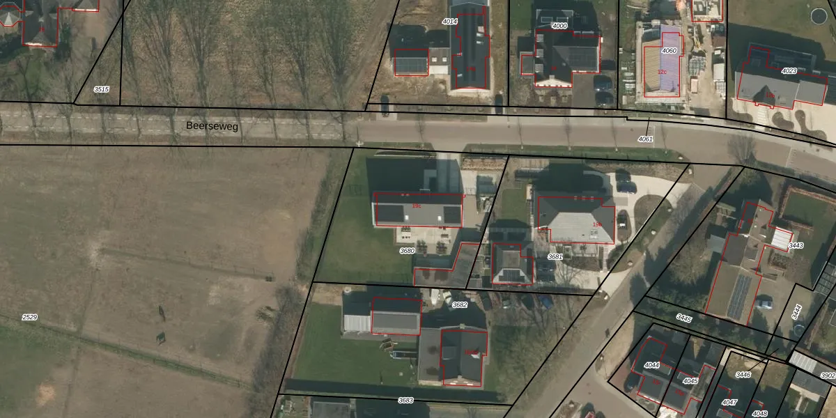 Beerseweg 19-c is gelegen op kadastraal perceel CUI00L3680. Deze kadastrale aanduiding is uniek en wordt gebruikt door het Kadaster om eigendomsrechten en andere zakelijke rechten vast te leggen. Het perceel maakt onderdeel uit van de kadastrale gemeente Cuijk.