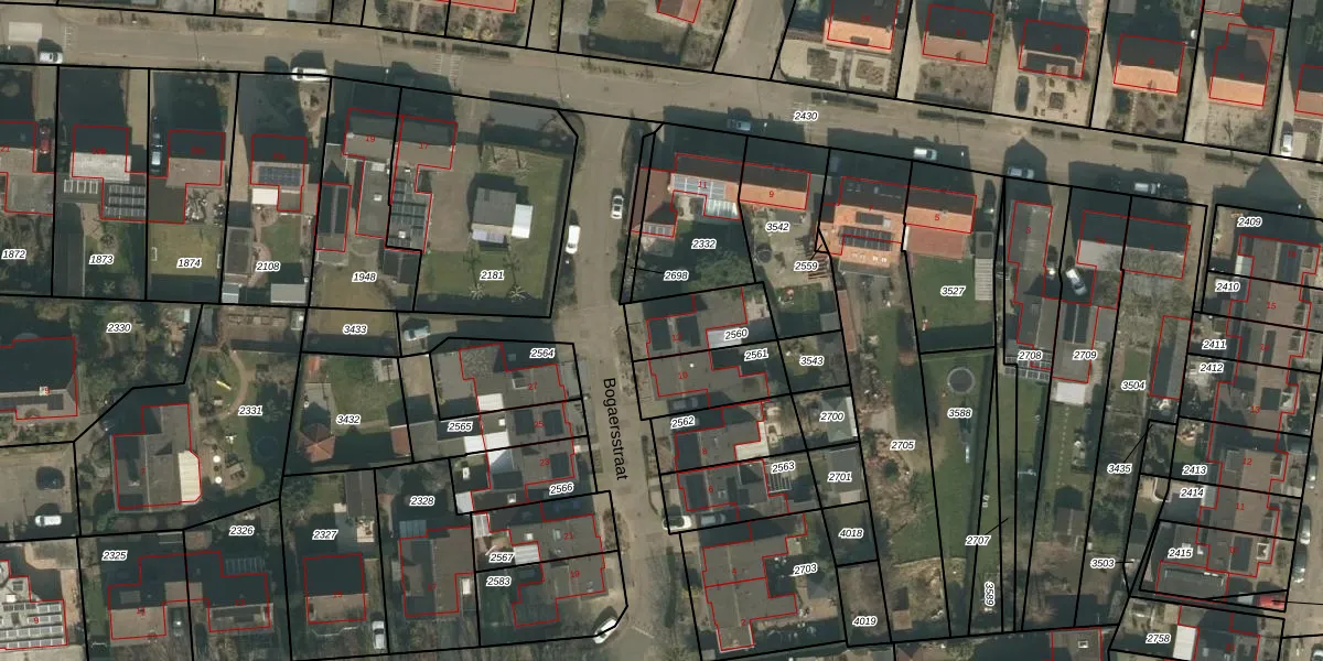 Bogaersstraat 12 is gelegen op kadastraal perceel CUI00L2560. Deze kadastrale aanduiding is uniek en wordt gebruikt door het Kadaster om eigendomsrechten en andere zakelijke rechten vast te leggen. Het perceel maakt onderdeel uit van de kadastrale gemeente Cuijk.
