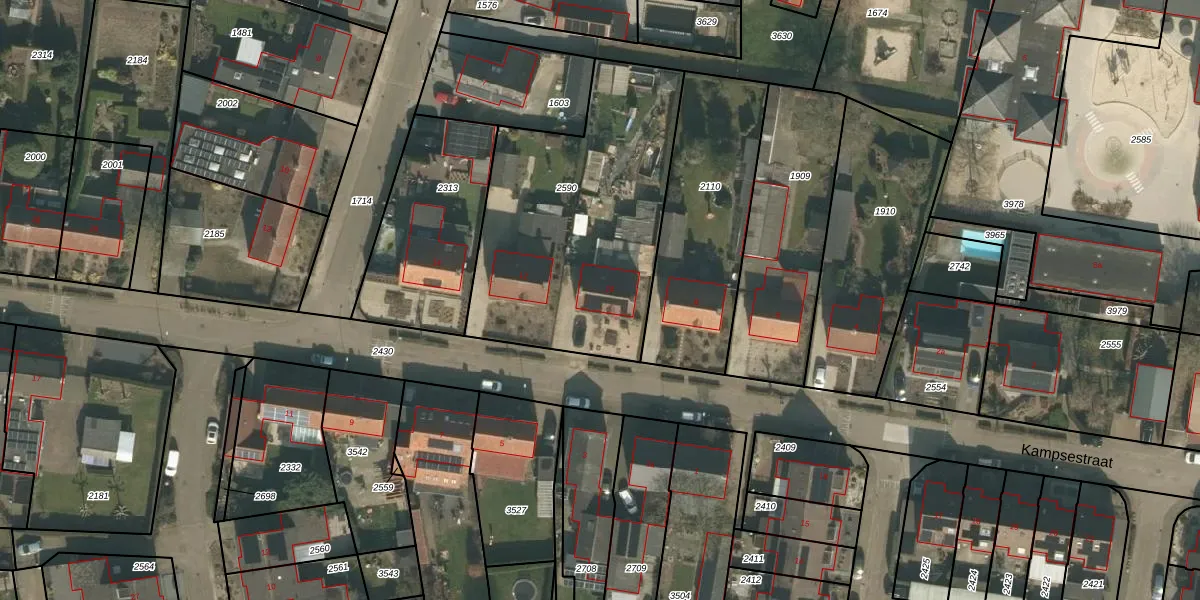 Kampsestraat 10 is gelegen op kadastraal perceel CUI00L2590. Deze kadastrale aanduiding is uniek en wordt gebruikt door het Kadaster om eigendomsrechten en andere zakelijke rechten vast te leggen. Het perceel maakt onderdeel uit van de kadastrale gemeente Cuijk.