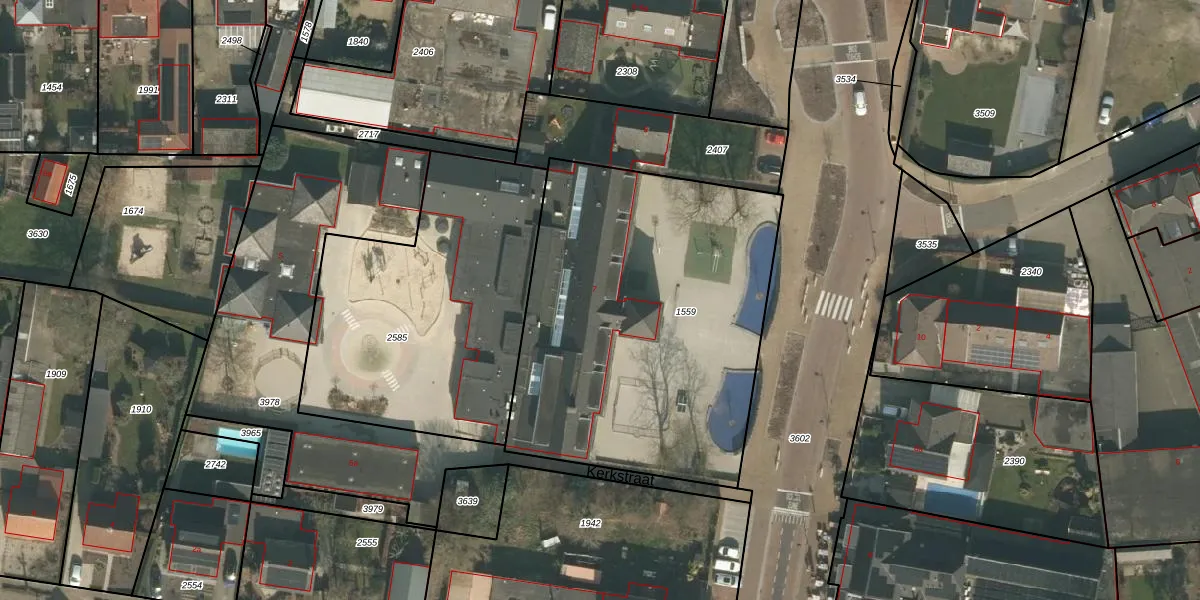 Het perceel waarop Kerkstraat 7 staat heeft een oppervlakte van 1950 m². Dit is een zeer groot perceel. De perceeloppervlakte wordt geregistreerd door het Kadaster. Gedetailleerde informatie over de maten van dit perceel kunt u vinden in het rapport Kadastrale kaart met maatvoering van Kerkstraat 7.