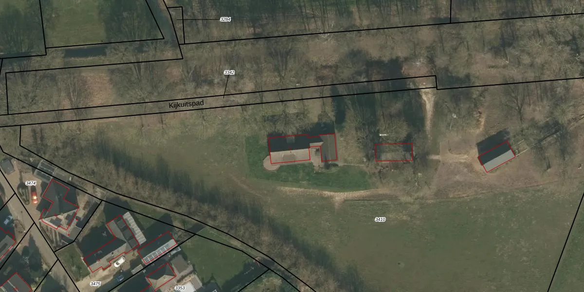 Het perceel waarop Kijkuitspad 1 staat heeft een oppervlakte van 1,1 ha. Dit is een zeer groot perceel. De perceeloppervlakte wordt geregistreerd door het Kadaster. Gedetailleerde informatie over de maten van dit perceel kunt u vinden in het rapport Kadastrale kaart met maatvoering van Kijkuitspad 1.