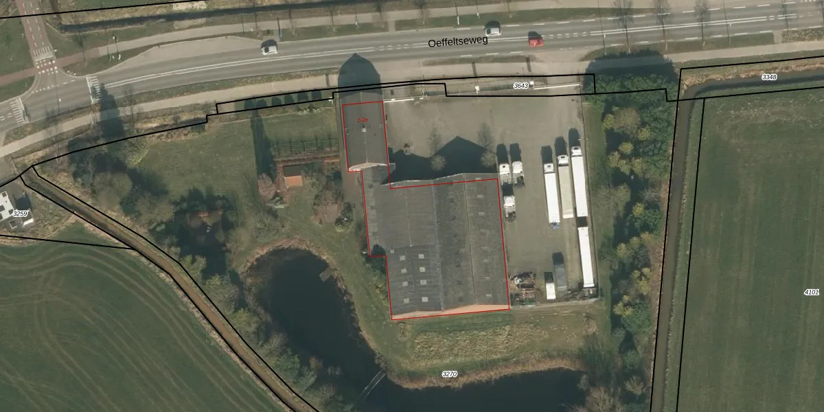 Het perceel waarop Oeffeltseweg 2 staat heeft een oppervlakte van 1,1 ha. Dit is een zeer groot perceel. De perceeloppervlakte wordt geregistreerd door het Kadaster. Gedetailleerde informatie over de maten van dit perceel kunt u vinden in het rapport Kadastrale kaart met maatvoering van Oeffeltseweg 2.