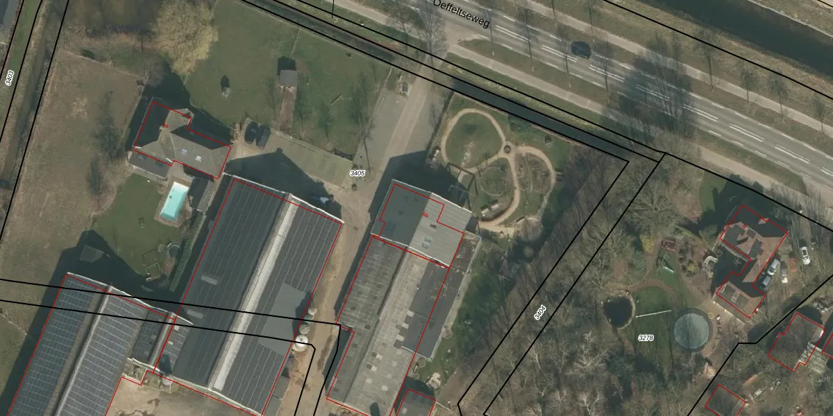Het perceel waarop Oeffeltseweg 6-b staat heeft een oppervlakte van 1,5 ha. Dit is een zeer groot perceel. De perceeloppervlakte wordt geregistreerd door het Kadaster. Gedetailleerde informatie over de maten van dit perceel kunt u vinden in het rapport Kadastrale kaart met maatvoering van Oeffeltseweg 6-b.