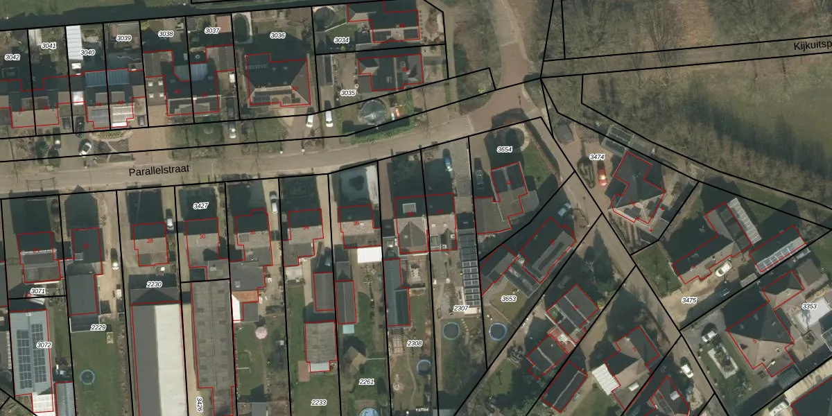 Parallelstraat 38 is gelegen op kadastraal perceel CUI00K2308. Deze kadastrale aanduiding is uniek en wordt gebruikt door het Kadaster om eigendomsrechten en andere zakelijke rechten vast te leggen. Het perceel maakt onderdeel uit van de kadastrale gemeente Cuijk.