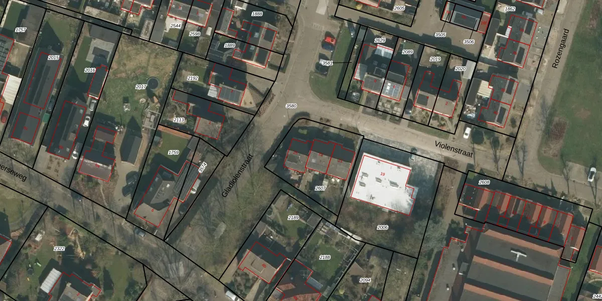 Het perceel waarop Violenstraat 25 staat heeft een oppervlakte van 624 m². Dit is een groot perceel. De perceeloppervlakte wordt geregistreerd door het Kadaster. Gedetailleerde informatie over de maten van dit perceel kunt u vinden in het rapport Kadastrale kaart met maatvoering van Violenstraat 25.