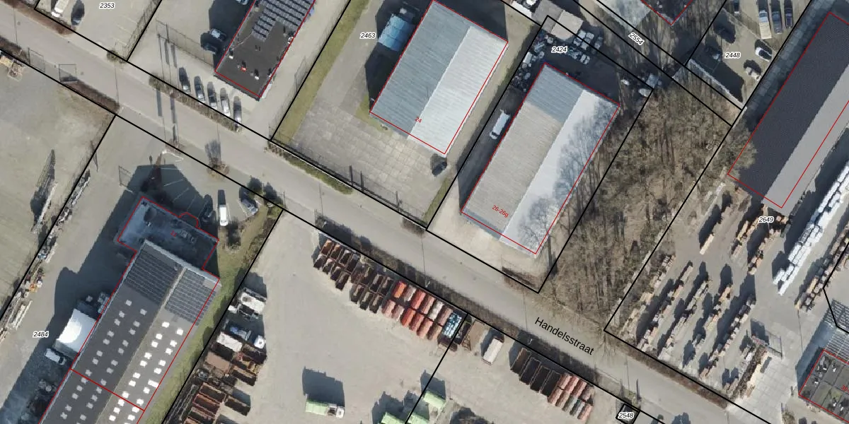 Het perceel waarop Handelsstraat 24-a staat heeft een oppervlakte van 2367 m². Dit is een zeer groot perceel. De perceeloppervlakte wordt geregistreerd door het Kadaster. Gedetailleerde informatie over de maten van dit perceel kunt u vinden in het rapport Kadastrale kaart met maatvoering van Handelsstraat 24-a.