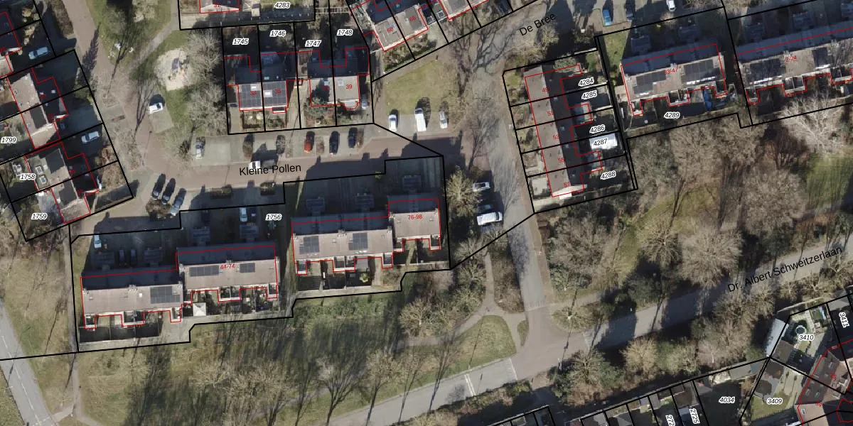 Het perceel waarop Kleine Pollen 96 staat heeft een oppervlakte van 2415 m². Dit is een zeer groot perceel. De perceeloppervlakte wordt geregistreerd door het Kadaster. Gedetailleerde informatie over de maten van dit perceel kunt u vinden in het rapport Kadastrale kaart met maatvoering van Kleine Pollen 96.