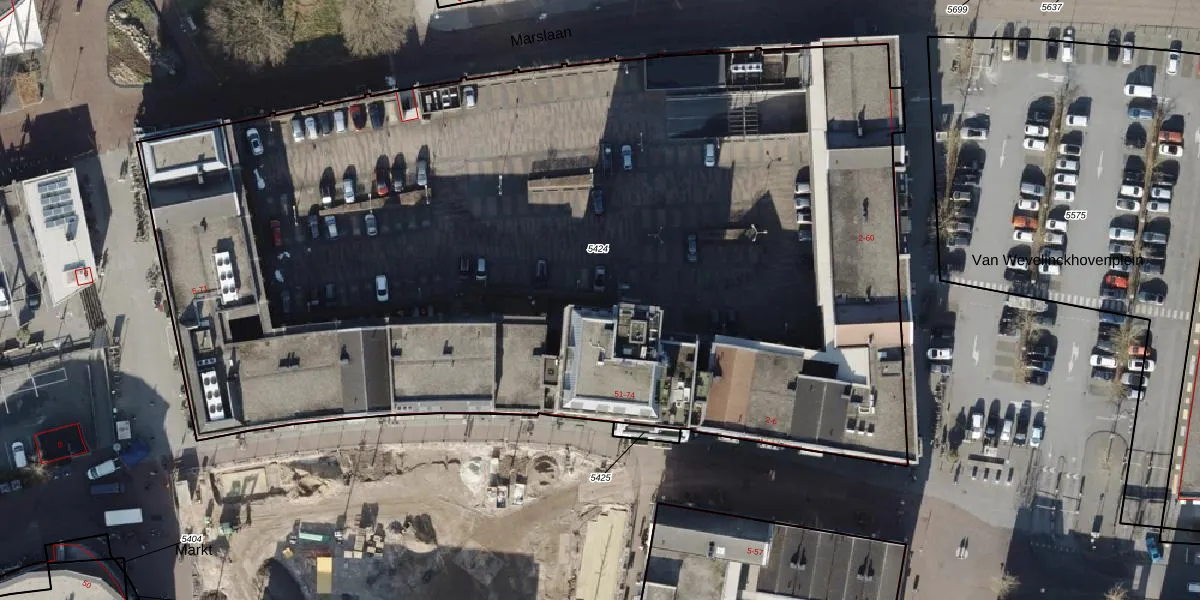 Het perceel waarop Markt 66 staat heeft een oppervlakte van 7163 m². Dit is een zeer groot perceel. De perceeloppervlakte wordt geregistreerd door het Kadaster. Gedetailleerde informatie over de maten van dit perceel kunt u vinden in het rapport Kadastrale kaart met maatvoering van Markt 66.
