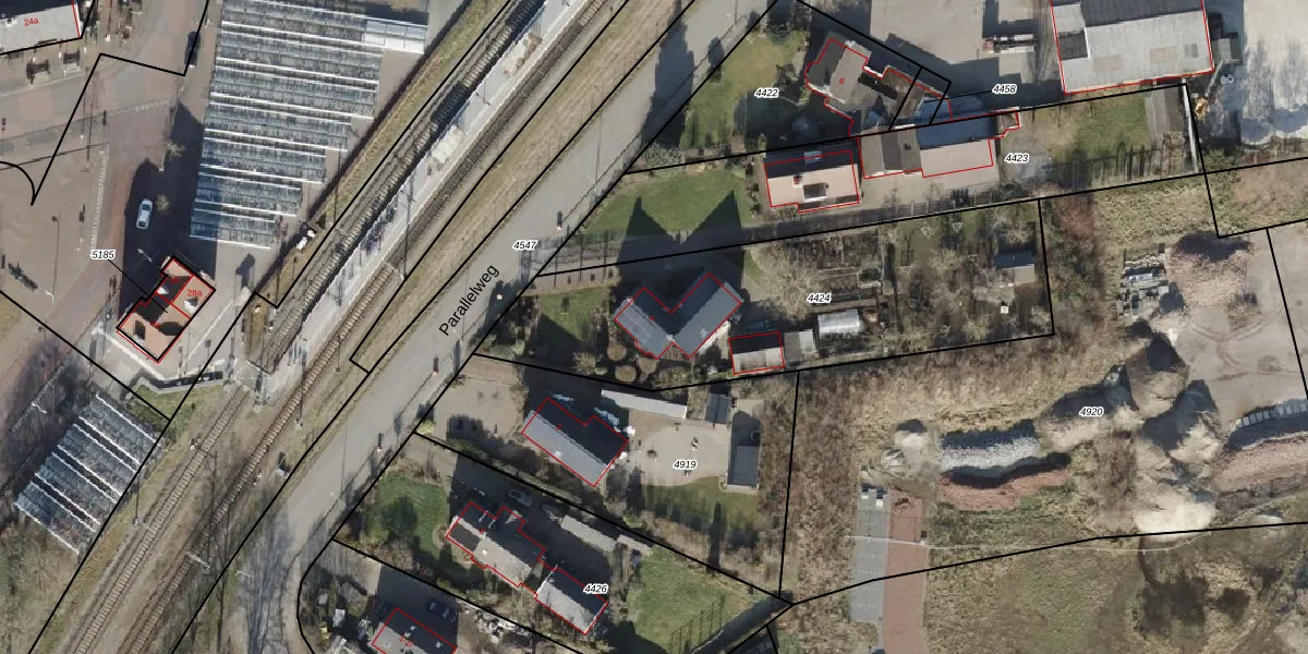 Het perceel waarop Parallelweg 4 staat heeft een oppervlakte van 1596 m². Dit is een zeer groot perceel. De perceeloppervlakte wordt geregistreerd door het Kadaster. Gedetailleerde informatie over de maten van dit perceel kunt u vinden in het rapport Kadastrale kaart met maatvoering van Parallelweg 4.