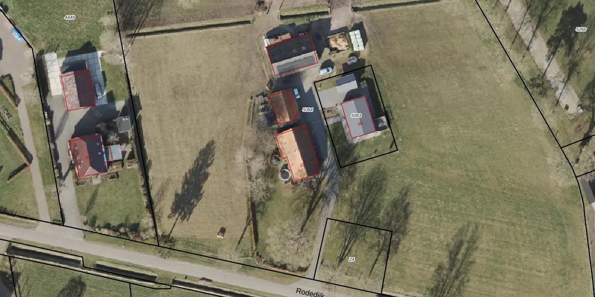Het perceel waarop Rodedijk 32 staat heeft een oppervlakte van 1,7 ha. Dit is een zeer groot perceel. De perceeloppervlakte wordt geregistreerd door het Kadaster. Gedetailleerde informatie over de maten van dit perceel kunt u vinden in het rapport Kadastrale kaart met maatvoering van Rodedijk 32.
