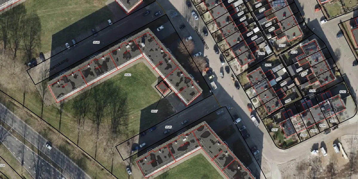 Het perceel waarop Spaanskamp 107 staat heeft een oppervlakte van 1,4 ha. Dit is een zeer groot perceel. De perceeloppervlakte wordt geregistreerd door het Kadaster. Gedetailleerde informatie over de maten van dit perceel kunt u vinden in het rapport Kadastrale kaart met maatvoering van Spaanskamp 107.