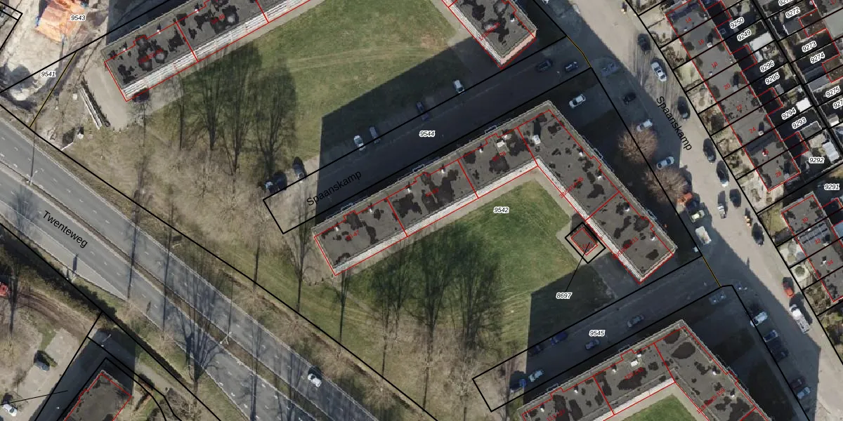 Het perceel waarop Spaanskamp 55 staat heeft een oppervlakte van 1,4 ha. Dit is een zeer groot perceel. De perceeloppervlakte wordt geregistreerd door het Kadaster. Gedetailleerde informatie over de maten van dit perceel kunt u vinden in het rapport Kadastrale kaart met maatvoering van Spaanskamp 55.