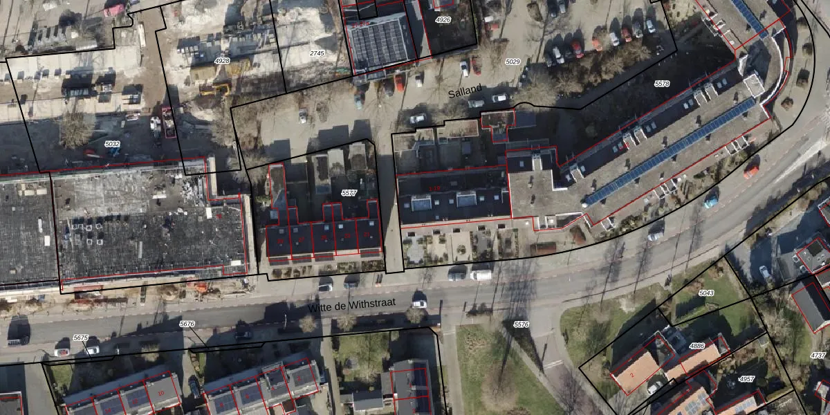Het perceel waarop Witte de Withstraat 19 staat heeft een oppervlakte van 4875 m². Dit is een zeer groot perceel. De perceeloppervlakte wordt geregistreerd door het Kadaster. Gedetailleerde informatie over de maten van dit perceel kunt u vinden in het rapport Kadastrale kaart met maatvoering van Witte de Withstraat 19.
