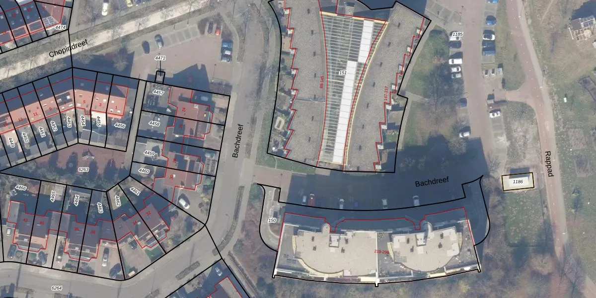 Het perceel waarop Bachdreef 103 staat heeft een oppervlakte van 2504 m². Dit is een zeer groot perceel. De perceeloppervlakte wordt geregistreerd door het Kadaster. Gedetailleerde informatie over de maten van dit perceel kunt u vinden in het rapport Kadastrale kaart met maatvoering van Bachdreef 103.