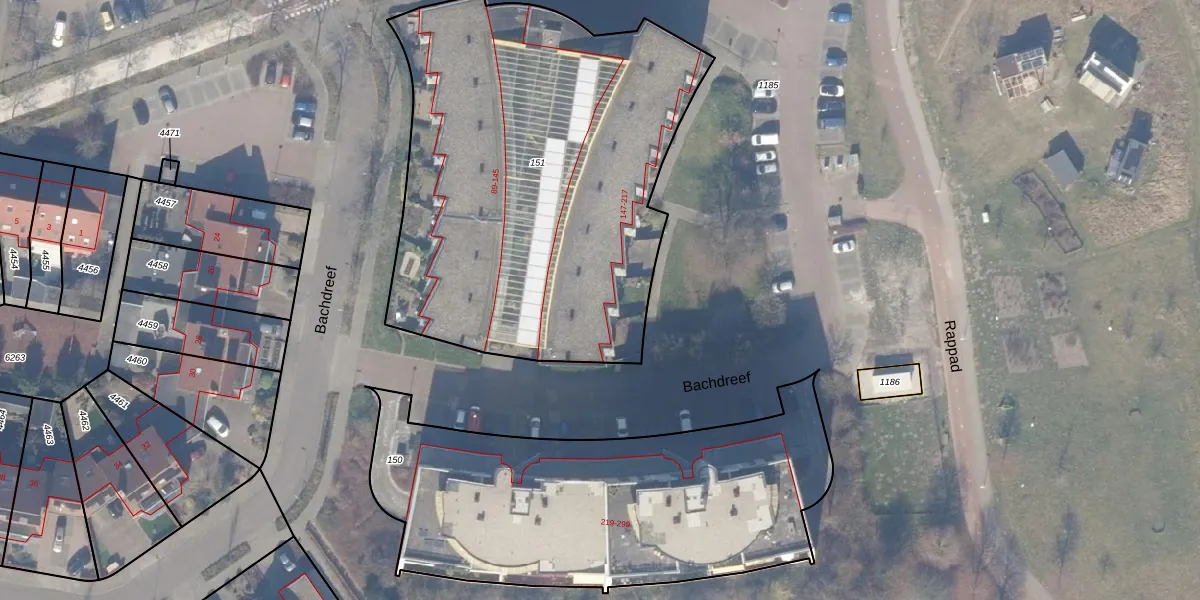 Het perceel waarop Bachdreef 151 staat heeft een oppervlakte van 2504 m². Dit is een zeer groot perceel. De perceeloppervlakte wordt geregistreerd door het Kadaster. Gedetailleerde informatie over de maten van dit perceel kunt u vinden in het rapport Kadastrale kaart met maatvoering van Bachdreef 151.