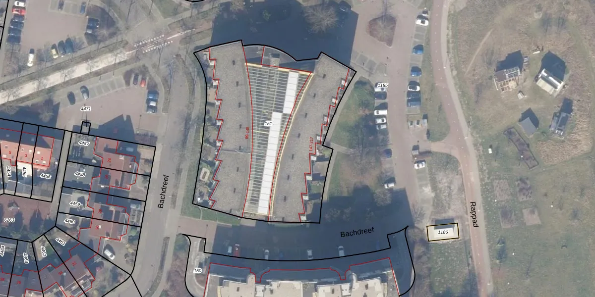 Het perceel waarop Bachdreef 179 staat heeft een oppervlakte van 2504 m². Dit is een zeer groot perceel. De perceeloppervlakte wordt geregistreerd door het Kadaster. Gedetailleerde informatie over de maten van dit perceel kunt u vinden in het rapport Kadastrale kaart met maatvoering van Bachdreef 179.