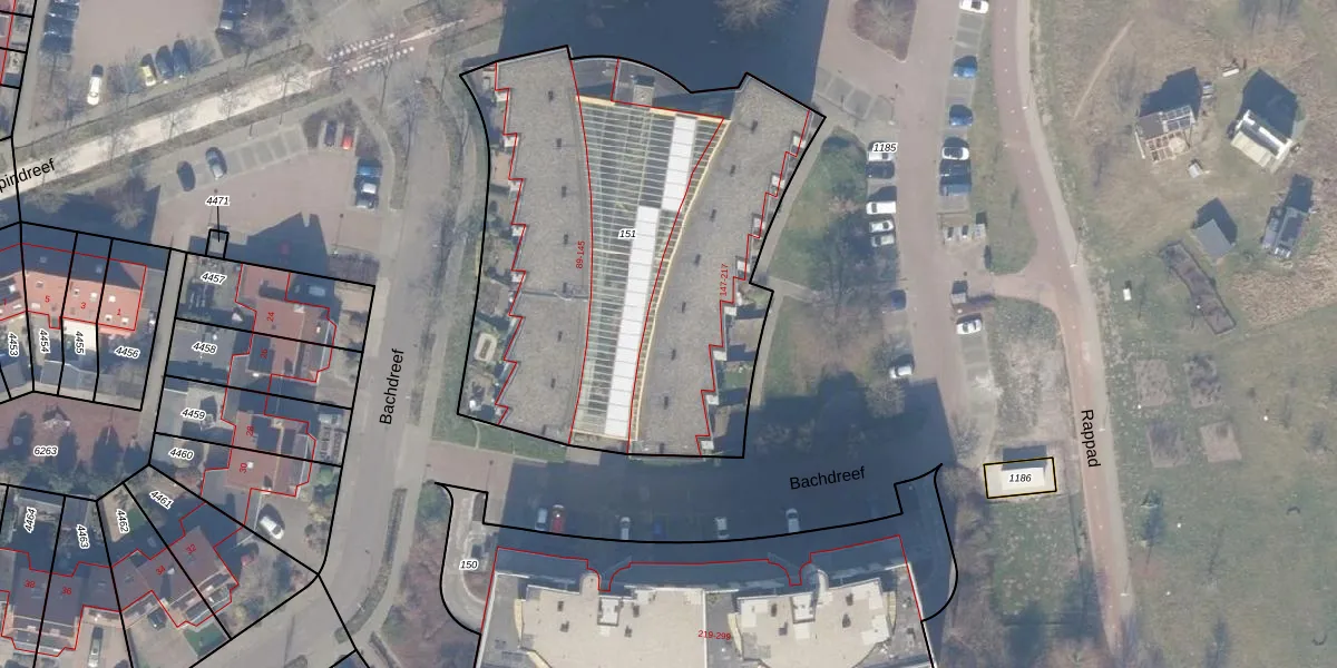 Het perceel waarop Bachdreef 197 staat heeft een oppervlakte van 2504 m². Dit is een zeer groot perceel. De perceeloppervlakte wordt geregistreerd door het Kadaster. Gedetailleerde informatie over de maten van dit perceel kunt u vinden in het rapport Kadastrale kaart met maatvoering van Bachdreef 197.