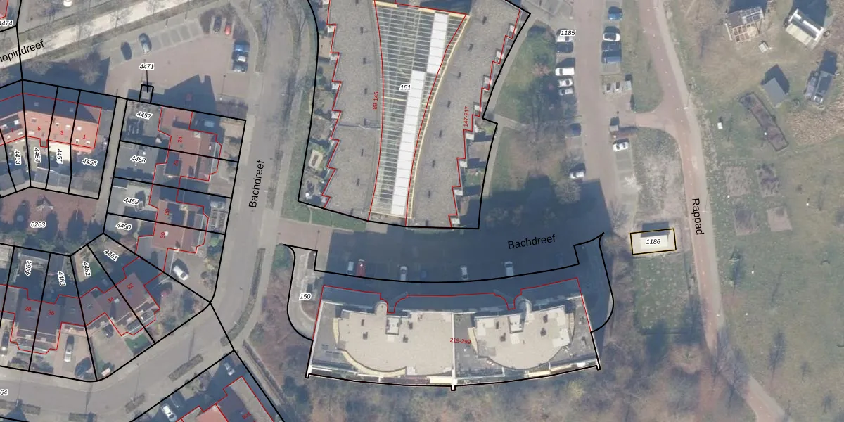 Het perceel waarop Bachdreef 201 staat heeft een oppervlakte van 2504 m². Dit is een zeer groot perceel. De perceeloppervlakte wordt geregistreerd door het Kadaster. Gedetailleerde informatie over de maten van dit perceel kunt u vinden in het rapport Kadastrale kaart met maatvoering van Bachdreef 201.