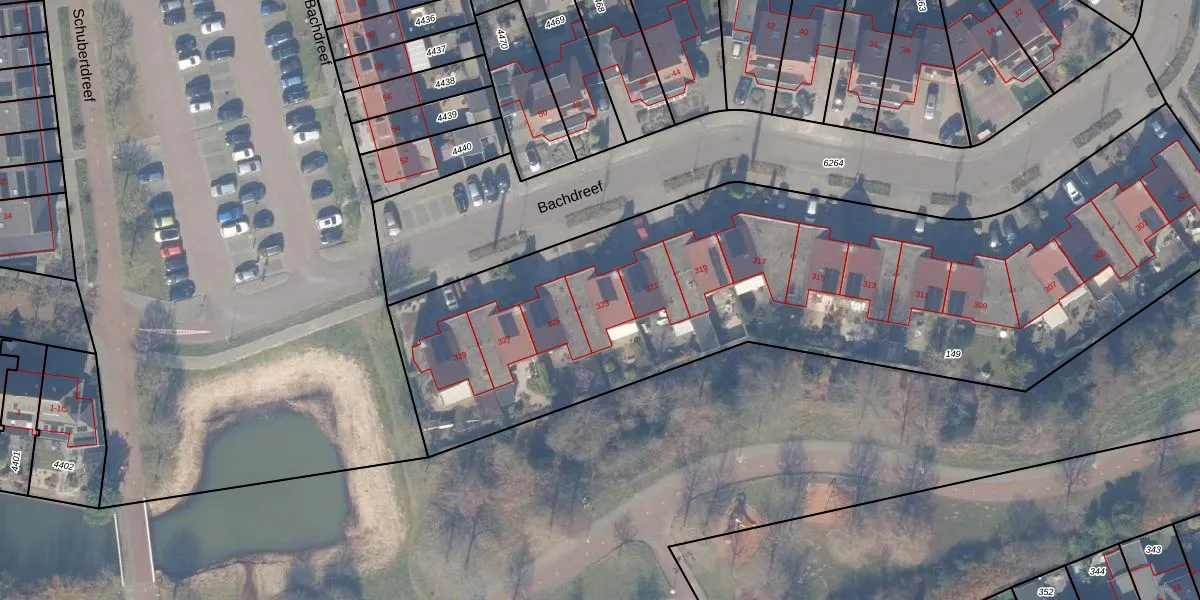 Het perceel waarop Bachdreef 323 staat heeft een oppervlakte van 3792 m². Dit is een zeer groot perceel. De perceeloppervlakte wordt geregistreerd door het Kadaster. Gedetailleerde informatie over de maten van dit perceel kunt u vinden in het rapport Kadastrale kaart met maatvoering van Bachdreef 323.