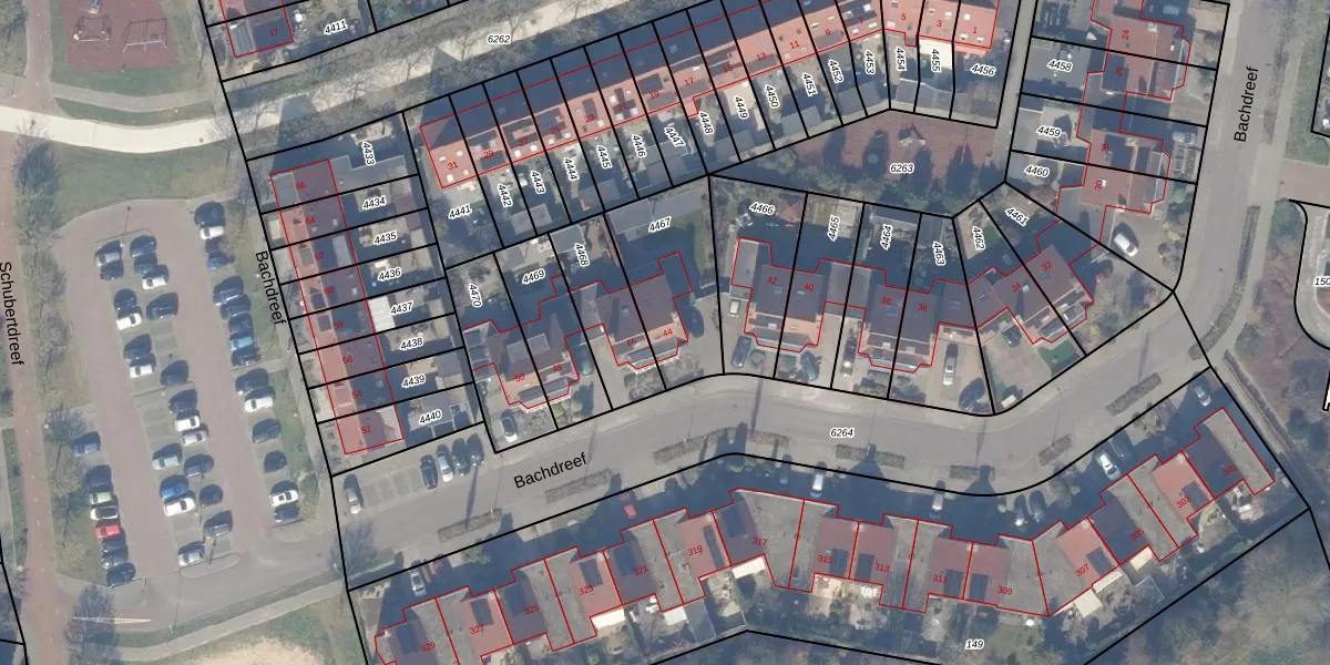 Het perceel waarop Bachdreef 44 staat heeft een oppervlakte van 372 m². Dit is een groot perceel. De perceeloppervlakte wordt geregistreerd door het Kadaster. Gedetailleerde informatie over de maten van dit perceel kunt u vinden in het rapport Kadastrale kaart met maatvoering van Bachdreef 44.
