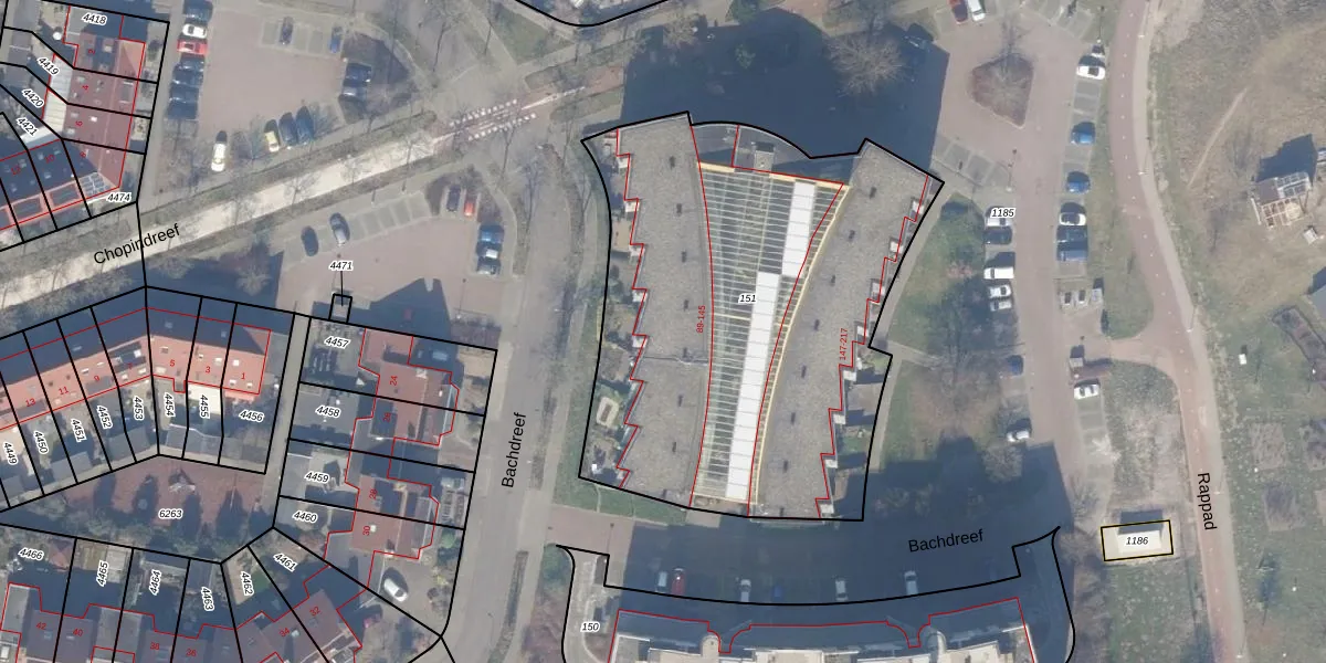 Het perceel waarop Bachdreef 97 staat heeft een oppervlakte van 2504 m². Dit is een zeer groot perceel. De perceeloppervlakte wordt geregistreerd door het Kadaster. Gedetailleerde informatie over de maten van dit perceel kunt u vinden in het rapport Kadastrale kaart met maatvoering van Bachdreef 97.